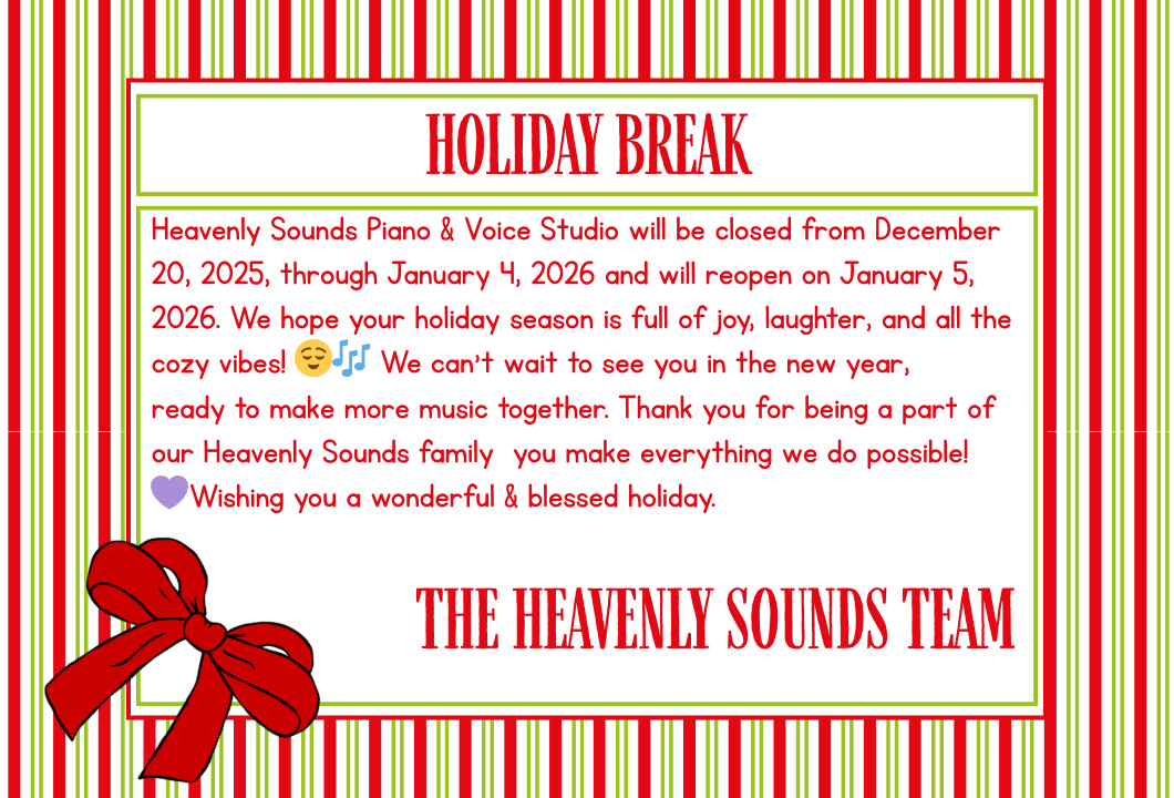Dear Heavenly Sounds Family, As we celebrate this joyful season, I want to thank you for allowing me to guide your musical journey. After 30 wonderful years of teaching, I am continually inspired by the dedication and growth I see in each of you. Music is a gift that unites us, and I am blessed to share it with such incredible students and families. Wishing you a season filled with peace, joy, and harmony. May your hearts stay as warm as the melodies you create. With gratitude, Stephanie...