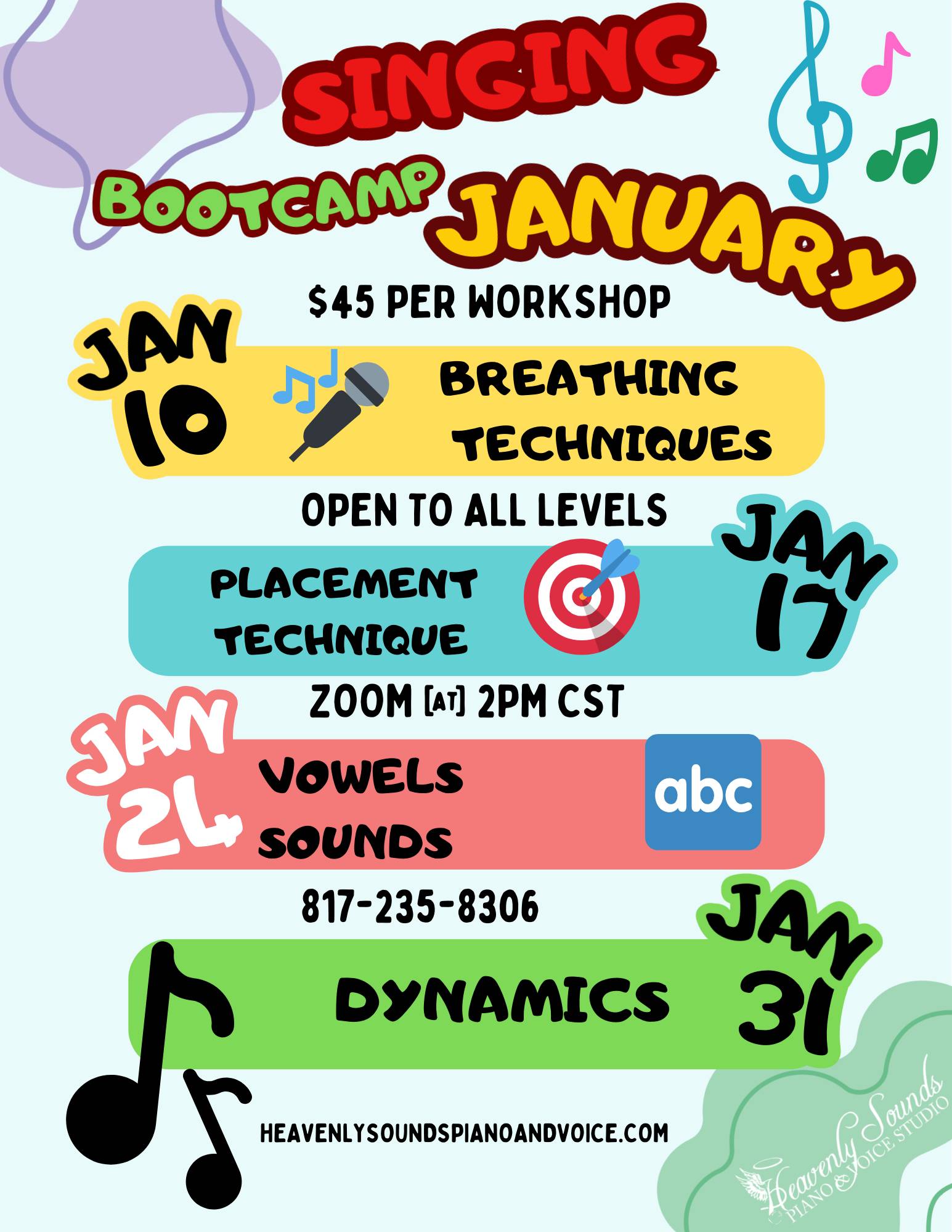 Hello Heavenly Sounds Family ๐, Happy New Year and welcome back! We hope your holiday break was full of rest, joy, and all the cozy vibes. We are officially back and so excited to jump into 2026 with you! ๐น๐ค Heavenly Sounds Piano & Voice Studio is now open, and we cannot wait to continue growing, learning, and making beautiful music together. New goals, fresh energy, and the same passion for excellence โจ Thank you for being such an incredible part of our Heavenly Sounds family. Your support and love for music mean everything to us, and weโre so grateful to walk this journey with you. Hereโs to a year filled with progress, confidence, and powerful performances. Letโs make it a good one ๐ช๐ถ โ Weโre kicking off the new year with our January Singing Boot Camp Series, designed to help singers of all levels strengthen technique, confidence, and control one skill at a time. Each boot camp focuses on a specific area of vocal development and takes place on Saturdays at 2:00 PM CST via Zoom. January Lineup:๐ค Breathing Techniques Boot Camp โ January 10 (https://tr.ee/9V8TEJAkod) These sessions are perfect whether youโre just getting started or looking to refine your technique with focused training. You may register for one or multiple boot camps each session stands on its own. ๐ Online via Zoom Spots are limited, so be sure to secure yours soon. Sign up Deadlineโฐ โ Block A-8pm-9pm CST -Sign up Ends: Jan 19, 2026 at 8:30 PM or Full (11 Slots) Block B- 9pm-10pm CST- Sign up ends: Jan 19, 2026 at 9:30 PM or Full (11 Slots) โJudges: โฐโ Sign up ends: Jan 18, 2026 at 8:30 PM Judge sign-ups are OPEN with 10 available spots, but only 2 judges will be selected for the official panel. Just click one of the flyers below or go to โbit.ly/4eA4po4โ Donโt just watch from the sidelines, step into the spotlight or help pick the winners! ๐ญ