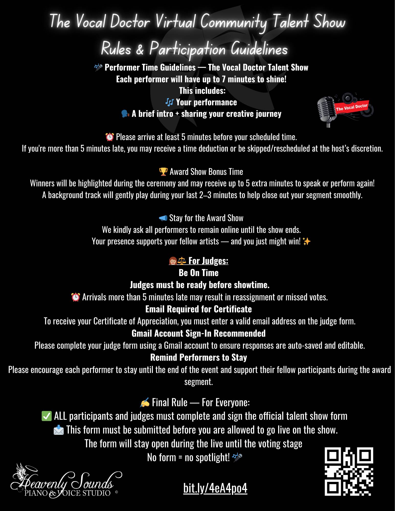 Hey Reader! This is it, your shot to be part of The Vocal Doctor π€Virtual Community πΆTalent Showβ¨ ποΈ Monday (1/19) @ 8 PM CST(LIVE on TikTok). Sign up Deadlineβ° β Block A-8pm-9pm CST -Sign up Ends: Jan 19, 2026 at 8:30 PM or Full (11 Slots) Block B- 9pm-10pm CST- Sign up ends: Jan 19, 2026 at 9:30 PM or Full (11 Slots) βJudges: β°β Sign up ends: Jan 18, 2026 at 8:30 PM Judge sign-ups are OPEN with 10 available spots, but only 2 judges will be selected for the official panel. β Just click one of the flyers below or go to βbit.ly/4eA4po4β Donβt just watch from the sidelines, step into the spotlight or help pick the winners! π